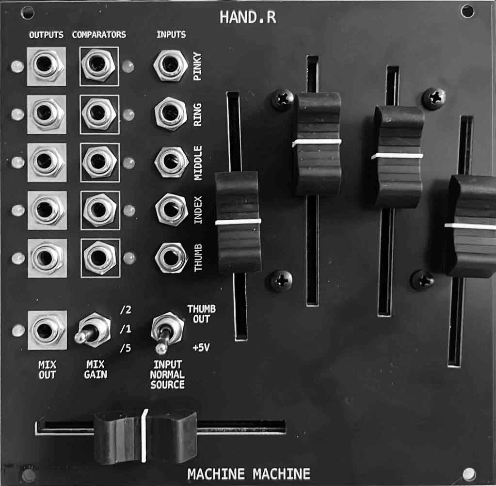 The four finger Inputs are also normalled via the Input Norm. Source toggle switch. You may select if the normalization is to +5V, or the Thumb Output. Selecting Thumb Output allows hand. to function as a multiple in addition to its other functions. The Thumb Input is always normalled to +5V when the jack is unconnected.
